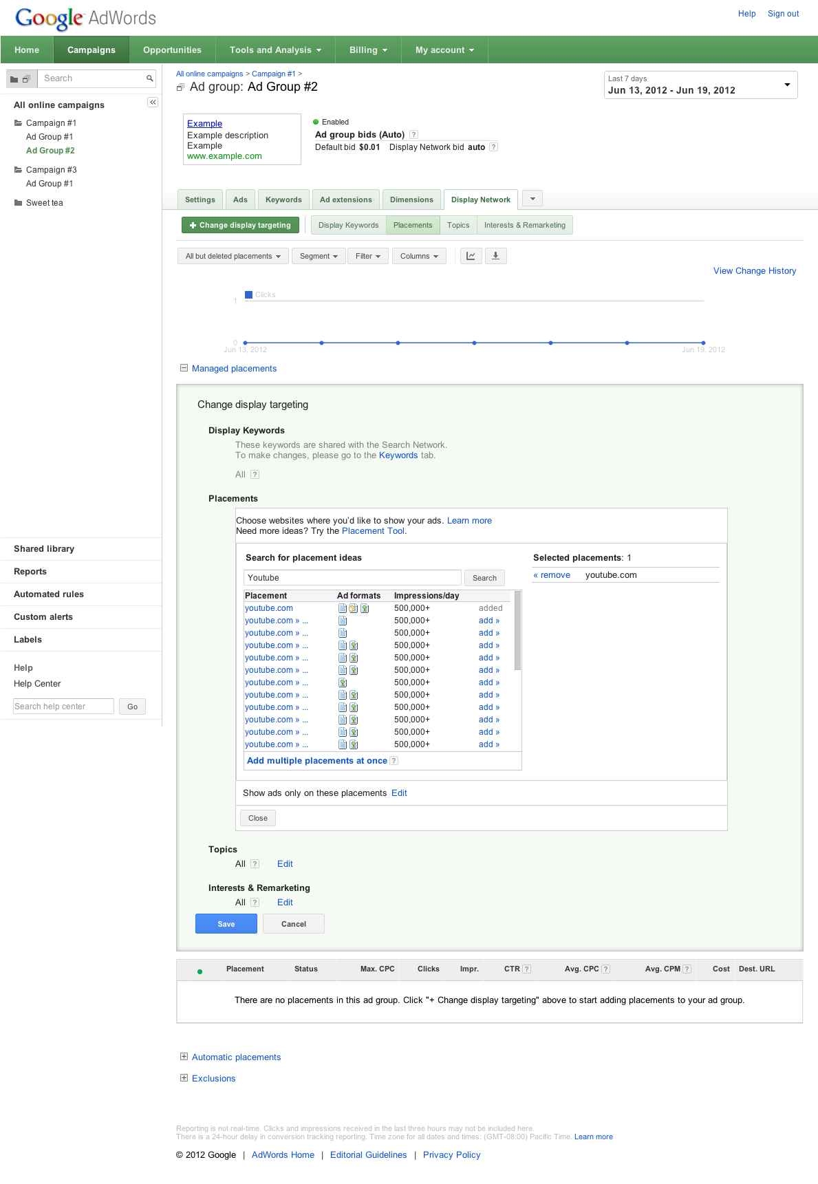 - 単価設定に対してのみこれらのプレースメントを使用する。「travel-example.com」と「luxurytravelexample.com」に対して入札単価を設定して、これらのプレースメントでの広告の表示回数を制御できます。ただし、キーワードなど、広告グループの他のターゲット設定方法に基づいて広告を他のウェブサイトに掲載することは可能です。